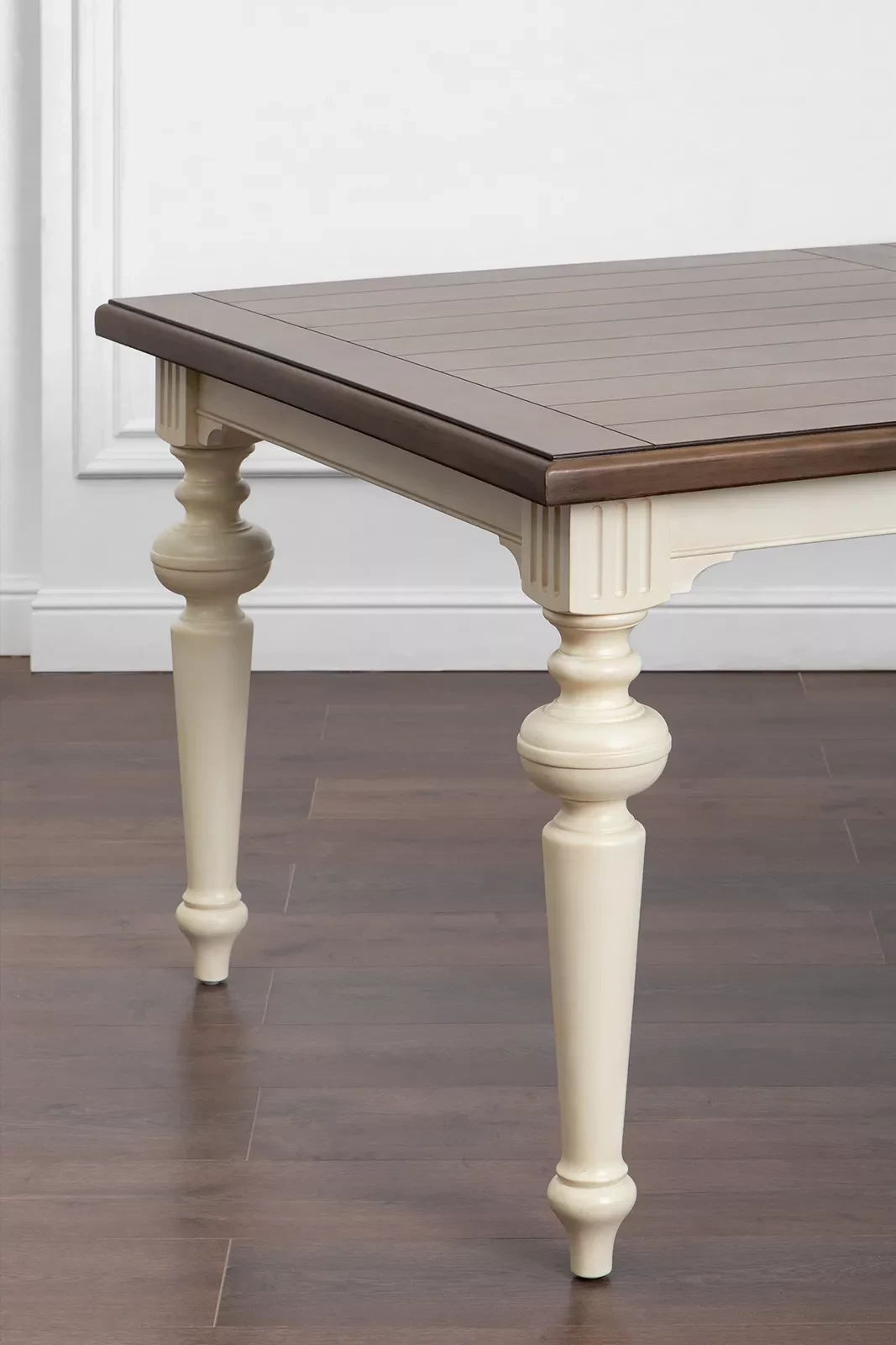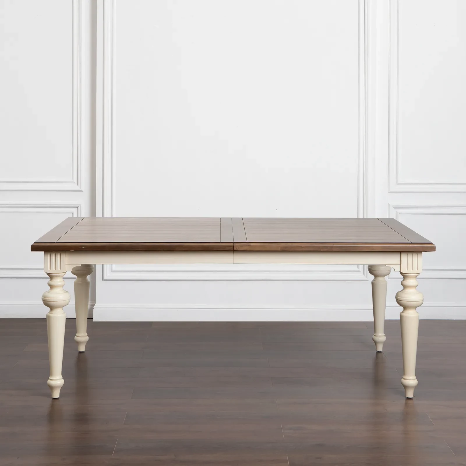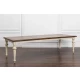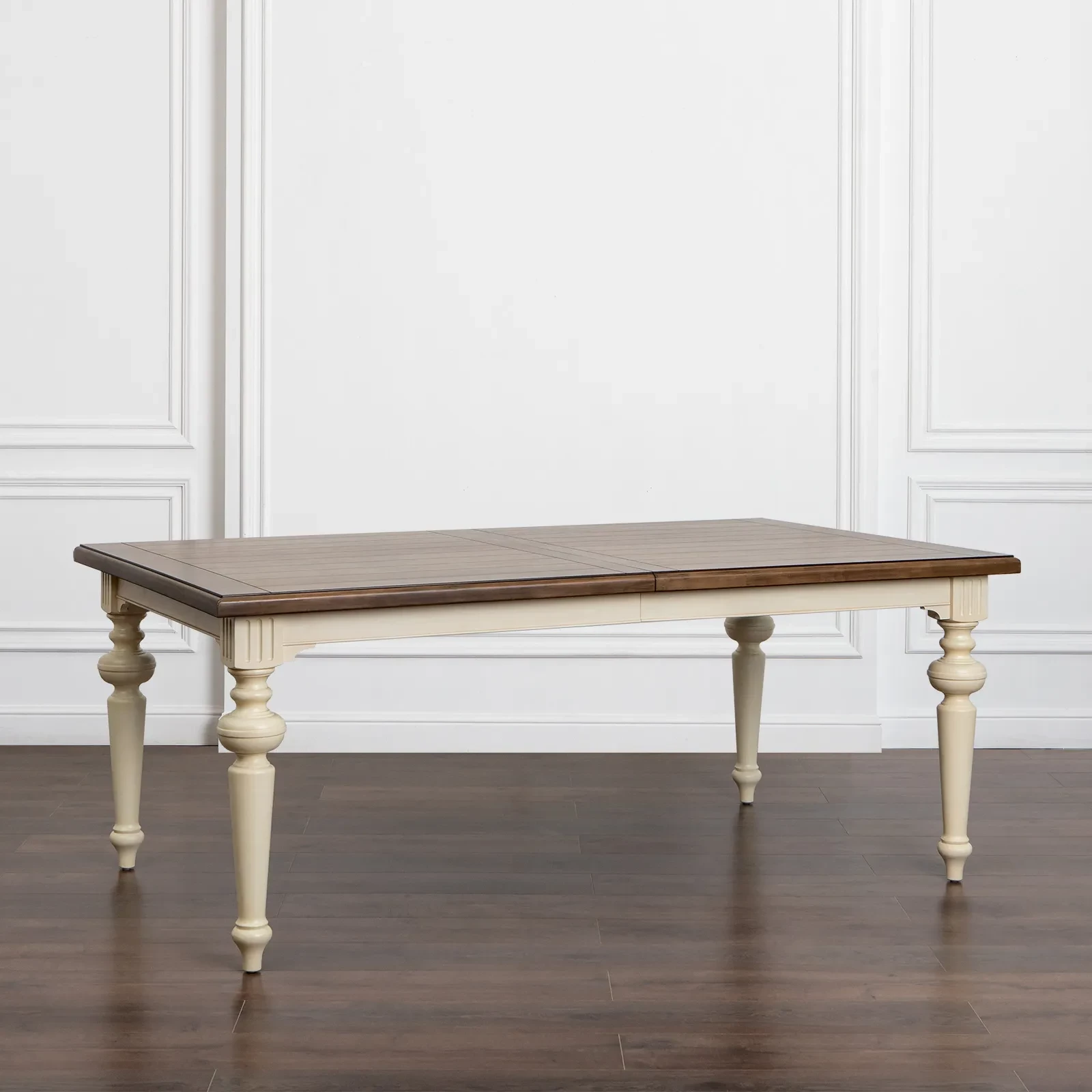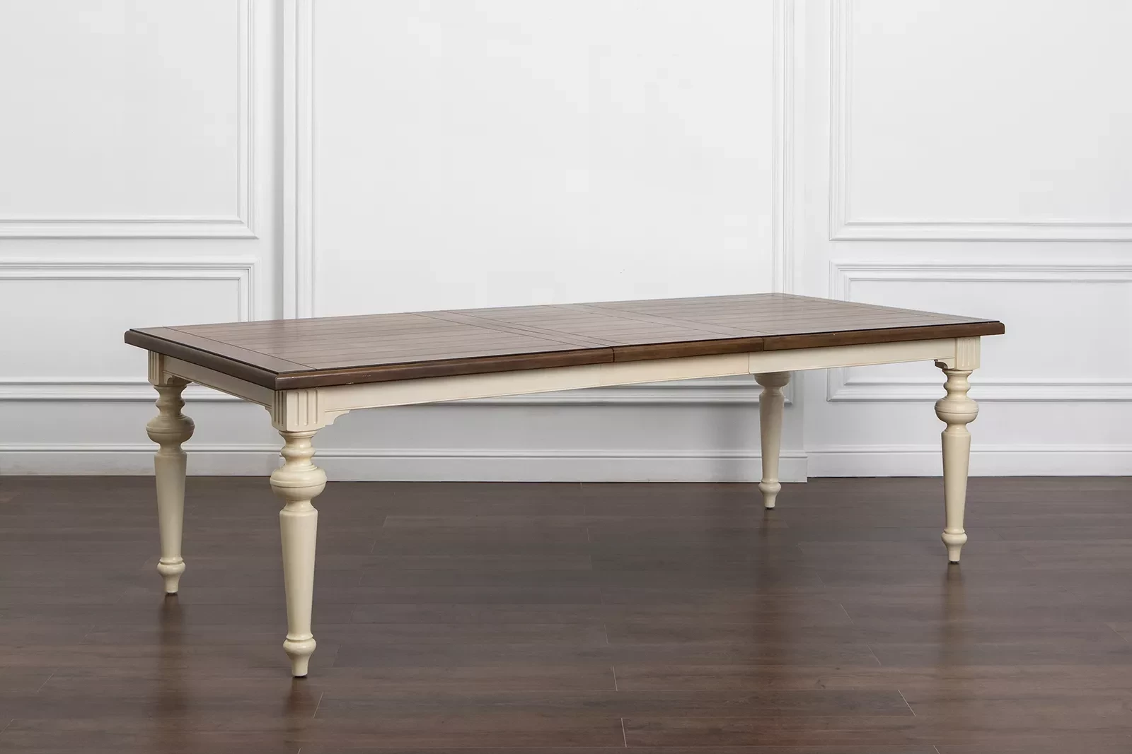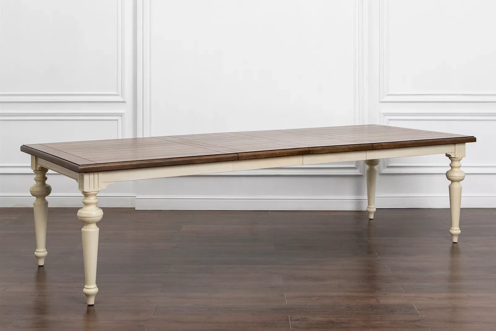 Большой раздвижной стол, выполненный из шпона клёна. Длина столешницы регулируется за счет двух вставок, каждая шириной 510 мм. С одной вставкой длина столешницы 2440 мм, с двумя - 2950 мм. Опоры и подстолье цвета слоновой кости, столешница - теплый коричневый.
