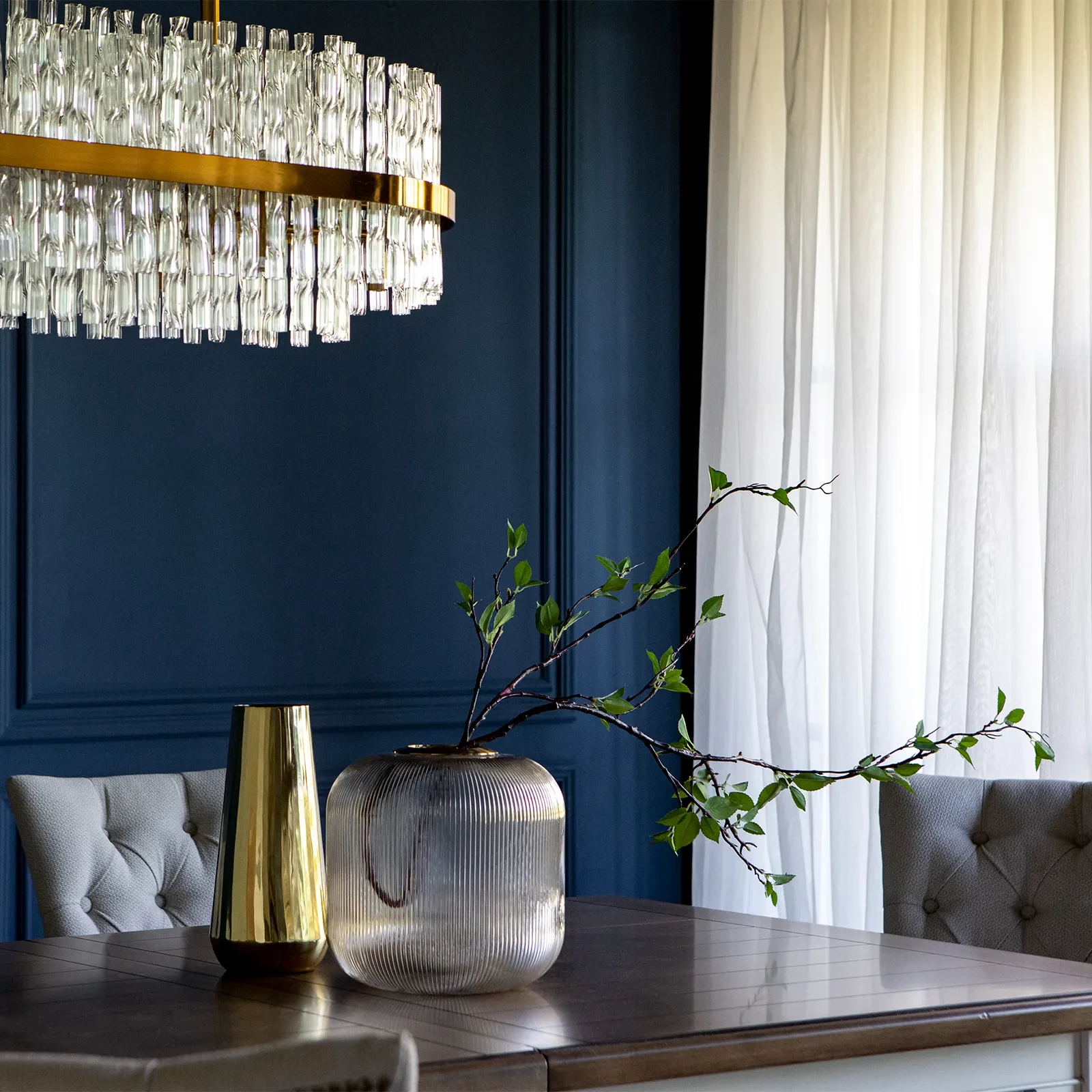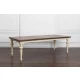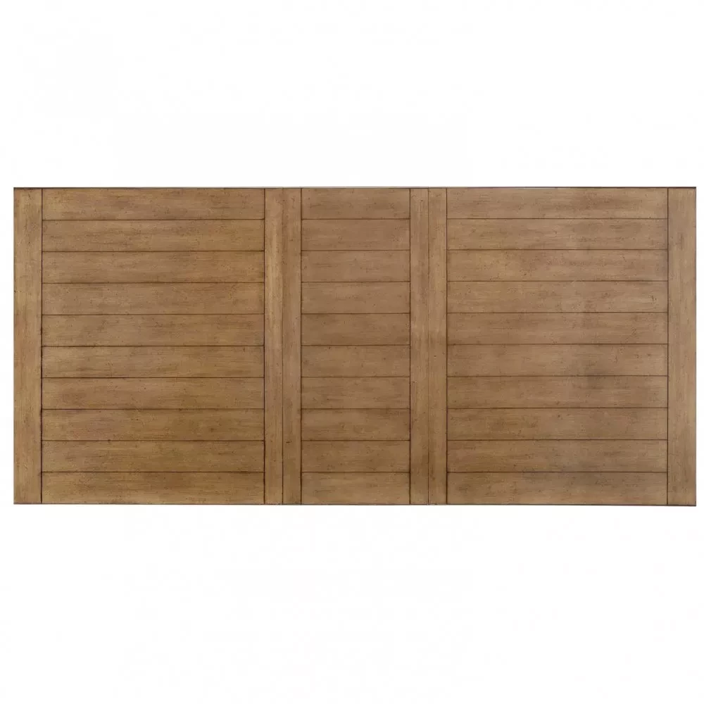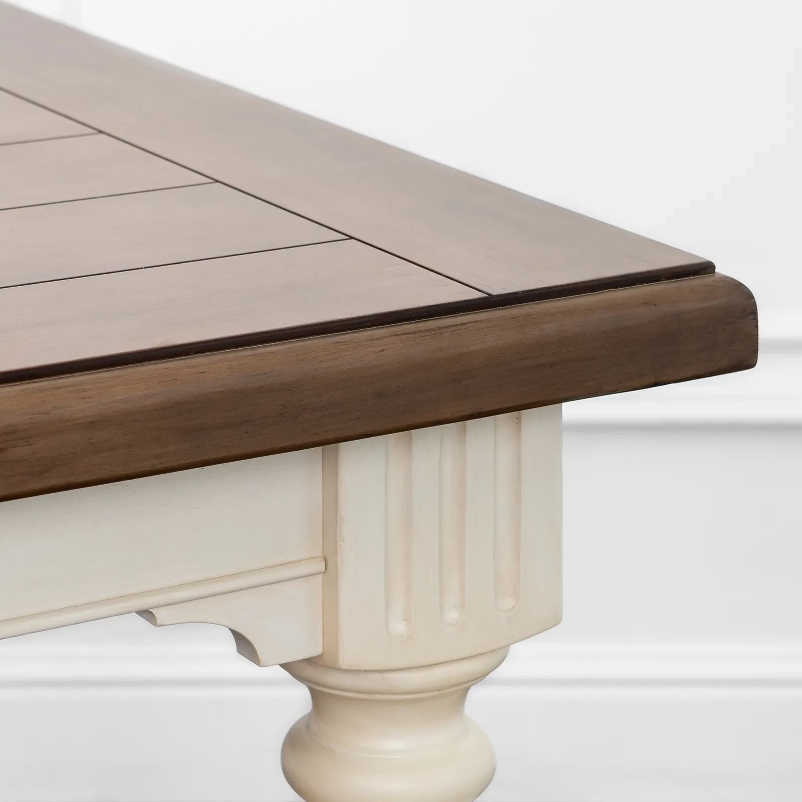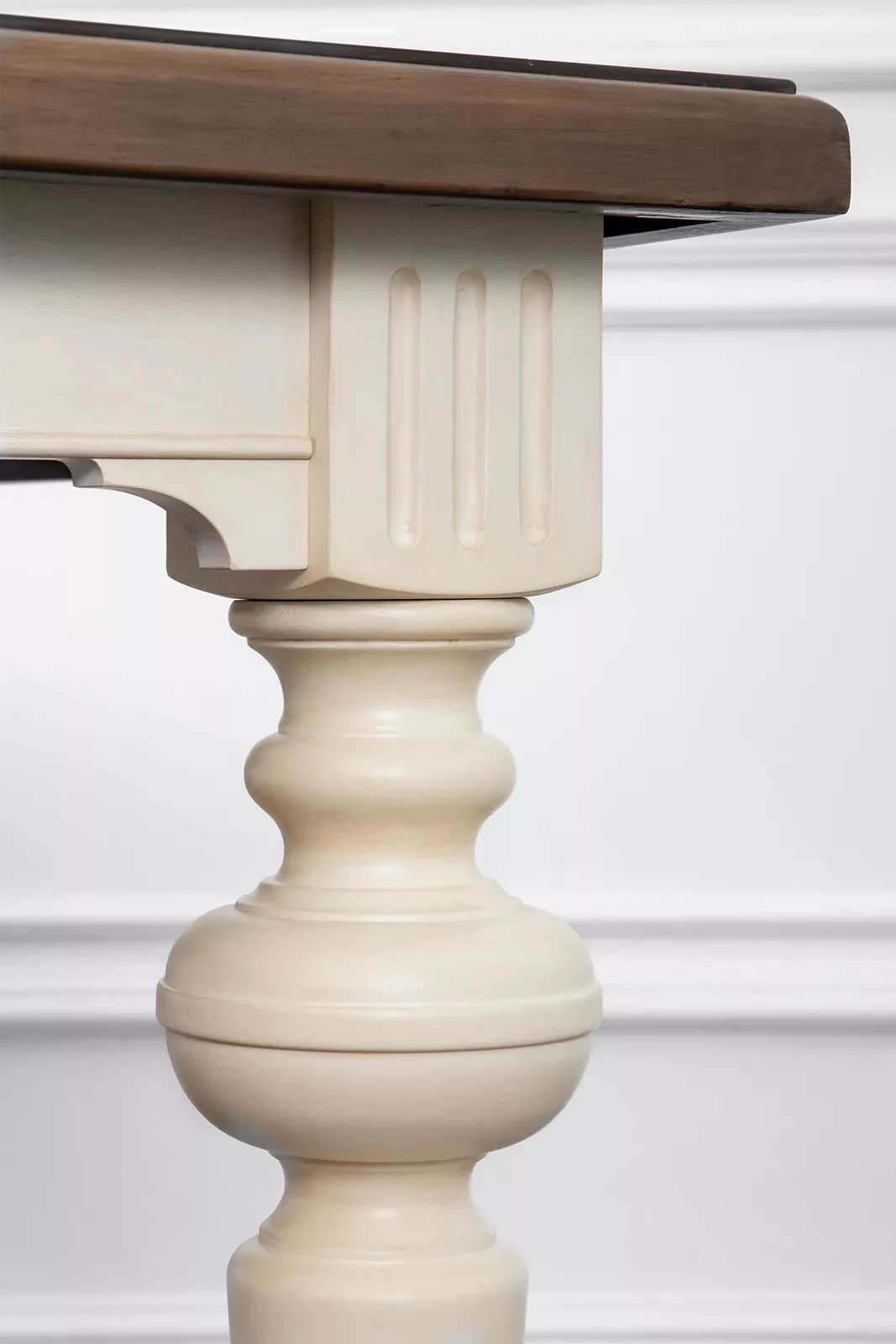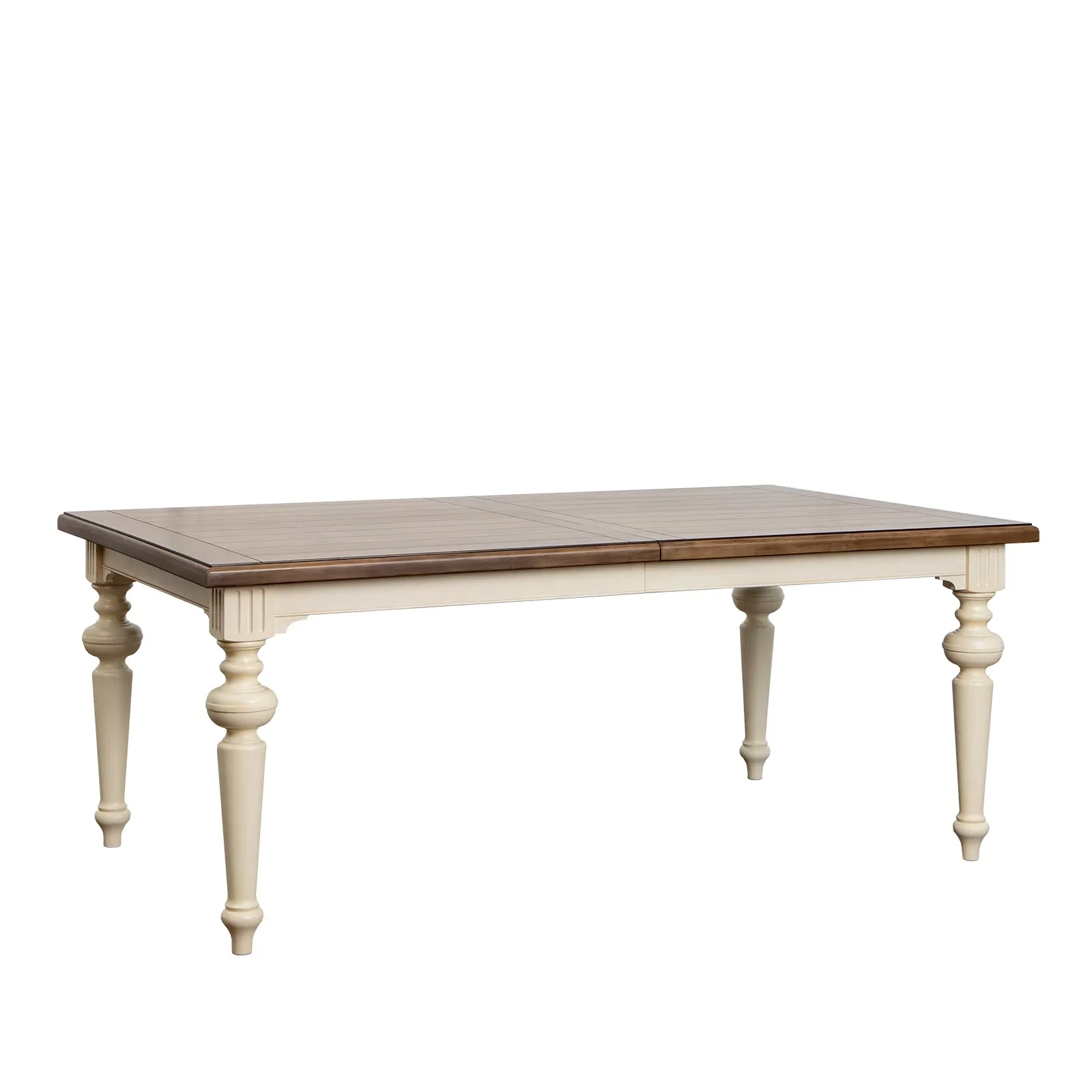 Большой раздвижной стол, выполненный из шпона клёна. Длина столешницы регулируется за счет двух вставок, каждая шириной 510 мм. С одной вставкой длина столешницы 2440 мм, с двумя - 2950 мм. Опоры и подстолье цвета слоновой кости, столешница - теплый коричневый.