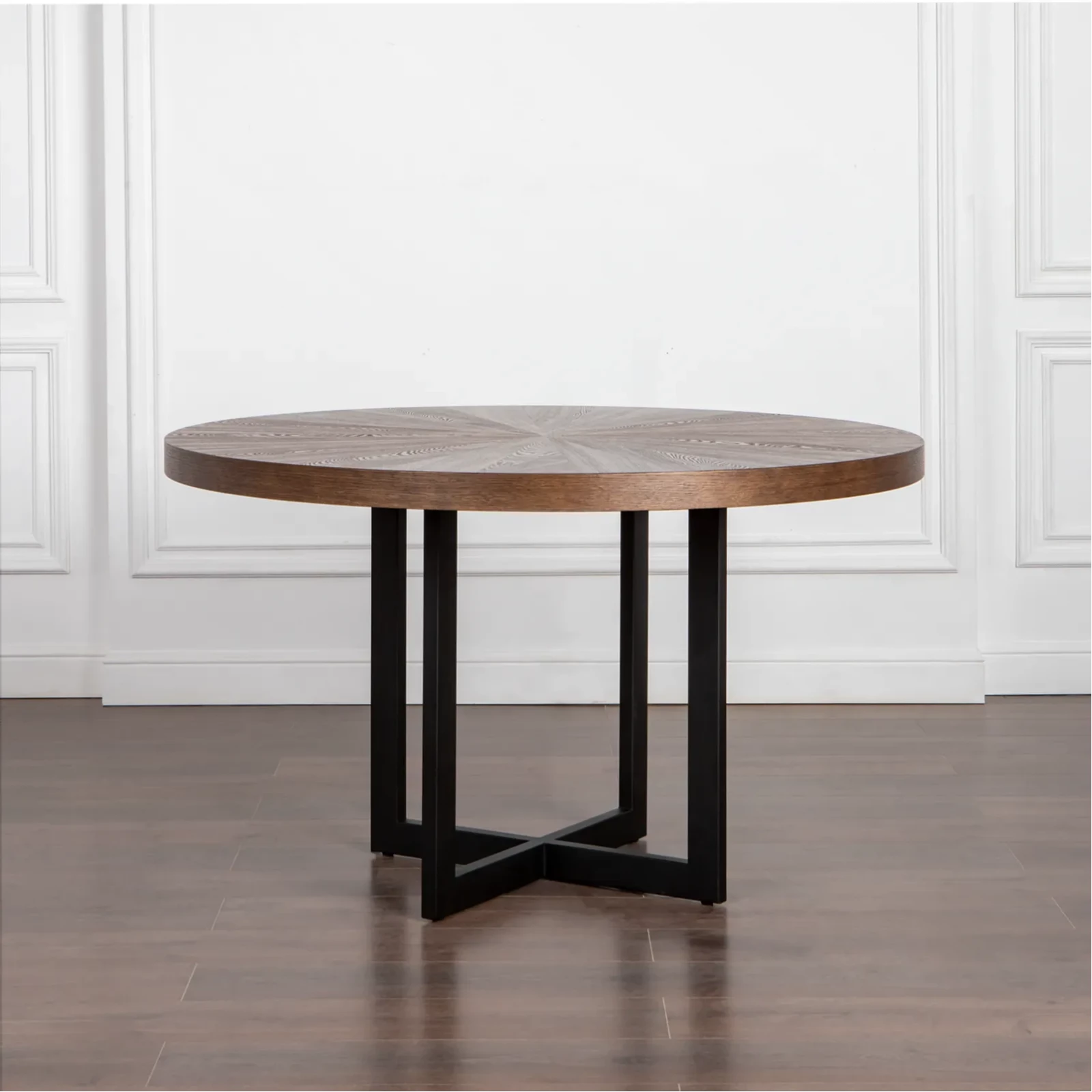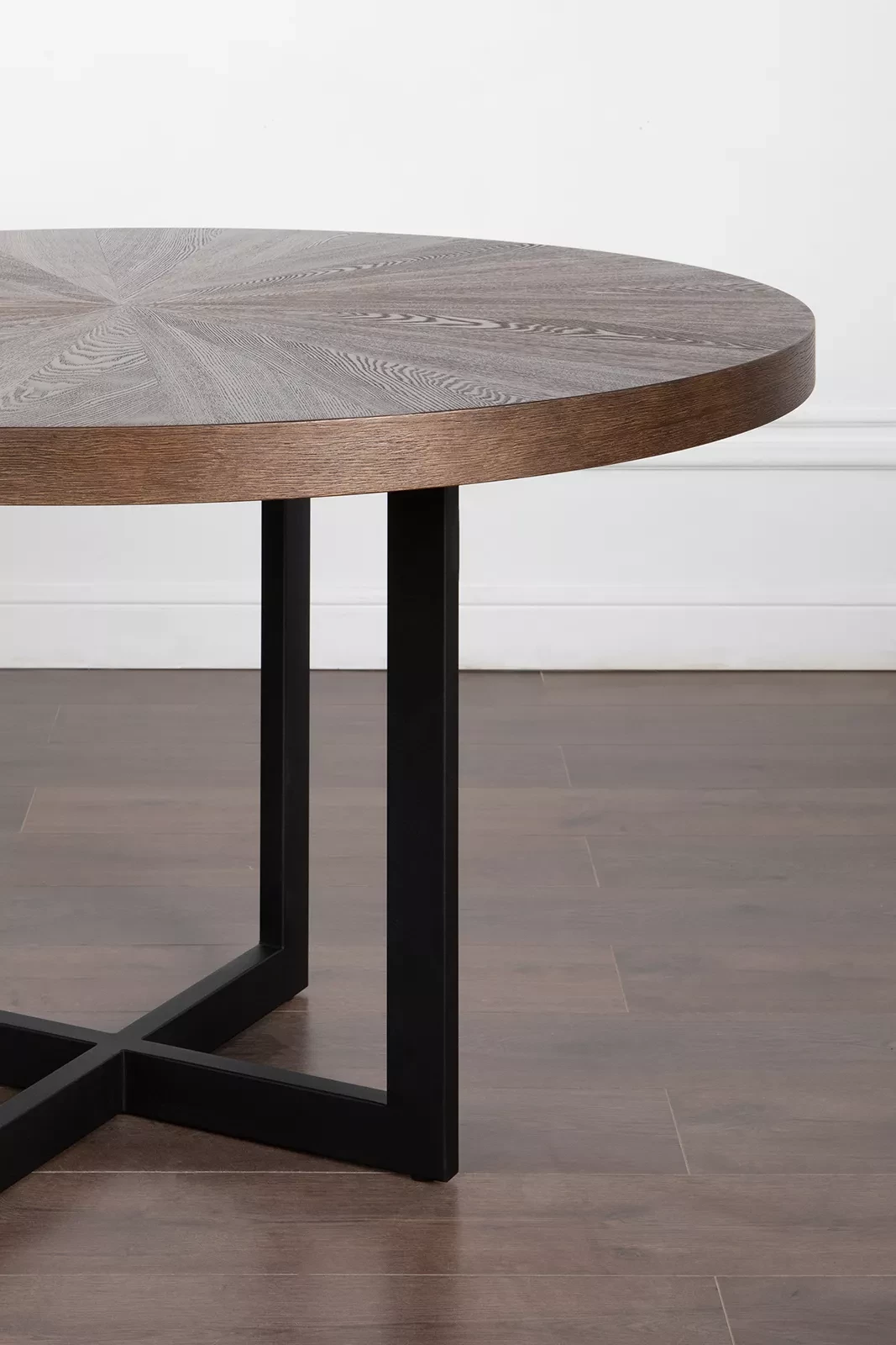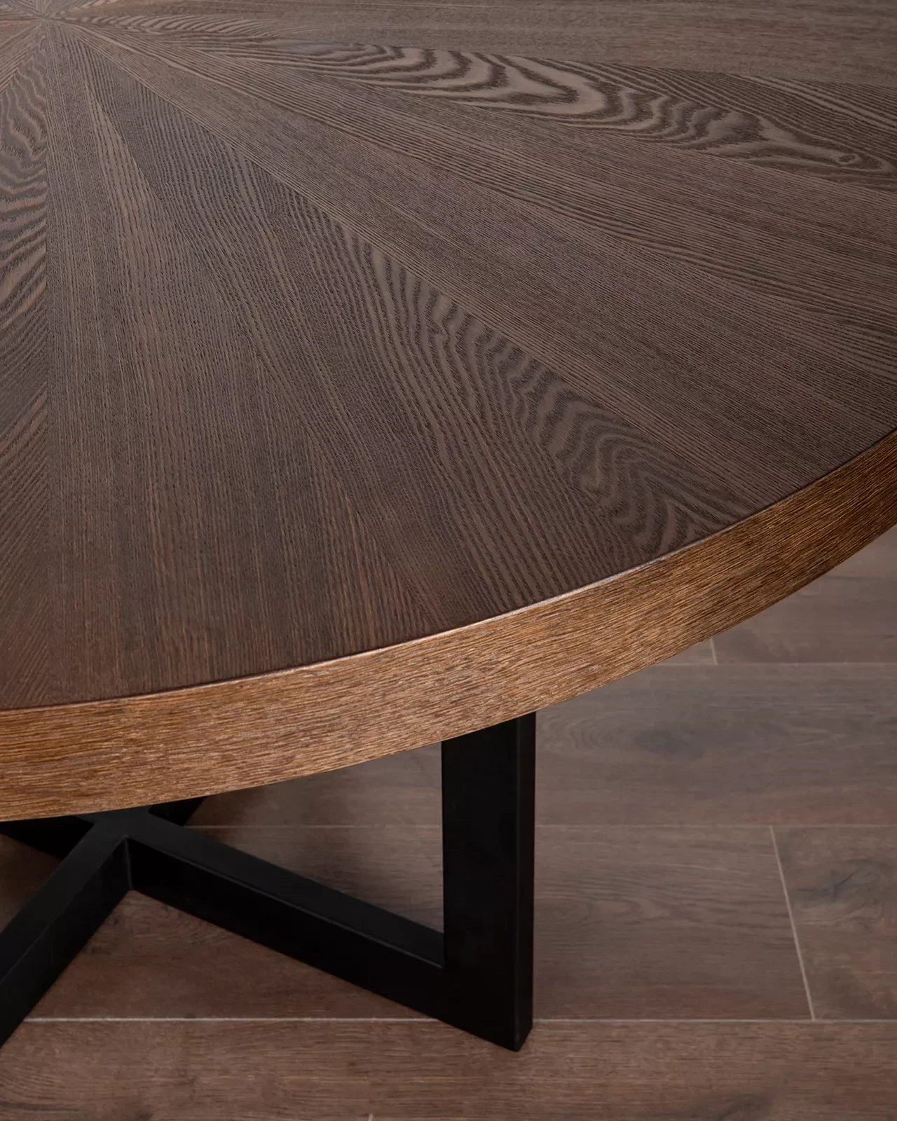 Обеденный стол FRAME круглой формы имеет наборную столешницу из шпона ясеня, которая красиво гармонирует с металлическими опорами в современной стилистике. Металлическая опора может быть в черном или латунно-никелевом со шлифованной фактурой. Цвет столешницы на выбор (более 10 вариантов морилок).